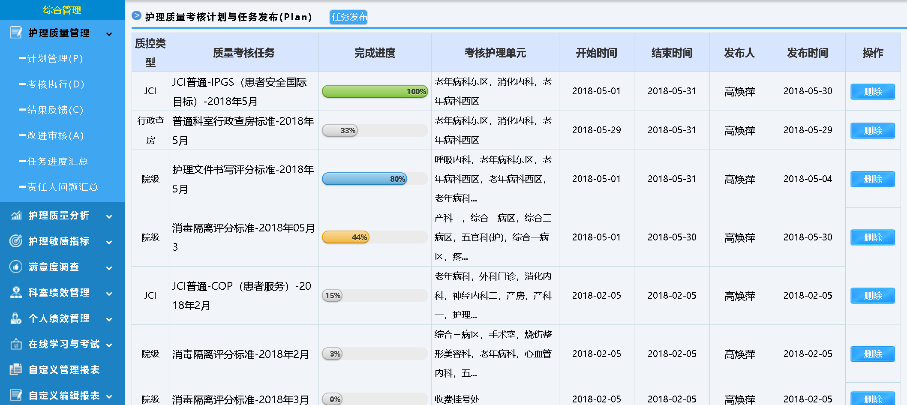 針對護(hù)理質(zhì)量管理重點(diǎn),支持自定義質(zhì)控表單,使用評分、扣分等多種考核方式,電子化護(hù)理質(zhì)量考核、持續(xù)跟蹤記錄,并可以用于統(tǒng)計(jì)分析。