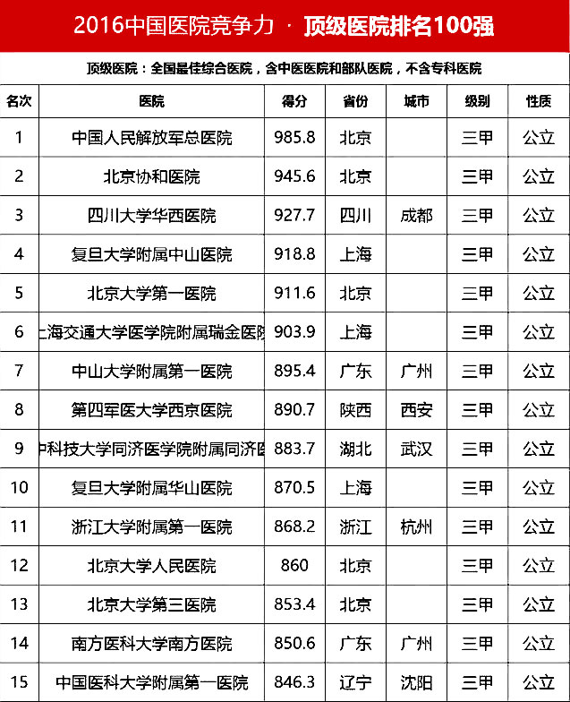 “頂級醫(yī)院100強(qiáng)”采用的排名指標(biāo)體系包括四個(gè)方面:醫(yī)院最優(yōu)規(guī)模(實(shí)開床位數(shù)、年門急診量、年出院量、全院人數(shù));醫(yī)療技術(shù)(正高職稱人數(shù)/全院人數(shù)、全院醫(yī)師人數(shù)/實(shí)開床位數(shù)、醫(yī)療設(shè)備資產(chǎn)/總資產(chǎn)、年住院手術(shù)量/年出院量、國家級衛(wèi)紀(jì)委臨床重點(diǎn)???總專科書、ICU床占比);醫(yī)院運(yùn)行(平均住院天數(shù)、床位使用率、門診均次費(fèi)用/當(dāng)?shù)厝司鵊DP、住院均次費(fèi)用/當(dāng)?shù)厝司鵊DP、外省住院病人占比);學(xué)術(shù)影響力(院士人數(shù)、學(xué)術(shù)領(lǐng)袖占比、教育部重點(diǎn)學(xué)科及重點(diǎn)實(shí)驗(yàn)室/總專科數(shù)、本年度獲國家自然科學(xué)基金項(xiàng)目數(shù)量和總?cè)~)。