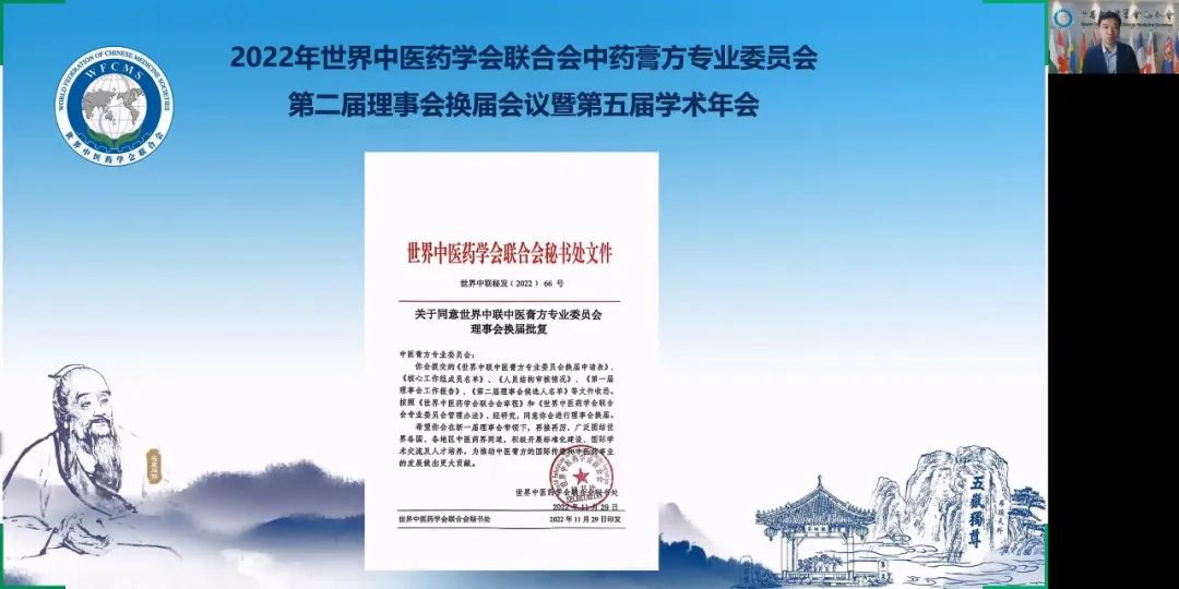 2022年12月4日上午,世界中醫(yī)藥學(xué)會聯(lián)合會(世界中聯(lián))中醫(yī)膏方專業(yè)委員會第二屆理事會換屆會議暨第五屆學(xué)術(shù)年會通過線上方式隆重召開。世界中聯(lián)主席馬建中向大會發(fā)來視頻致辭,學(xué)術(shù)部主任焦云洞代表世界中聯(lián)參加大會,全國政協(xié)委員、首都名中醫(yī)、享受國務(wù)院政府特殊津貼專家、世界中聯(lián)中醫(yī)膏方專業(yè)委員會會長、北京康益德中西醫(yī)結(jié)合肺科醫(yī)院董事長兼院長董瑞和顧問、副會長、常務(wù)理事、理事及會員共335人參加了大會。其中來自匈牙利、葡萄牙、澳大利亞、俄羅斯、瑞典、波蘭、英國、美國、芬蘭、韓國、中國香港、中國澳門、中國臺灣等地的外籍專家學(xué)者65人。會議由第一屆理事會秘書長秦洪義教授主持。