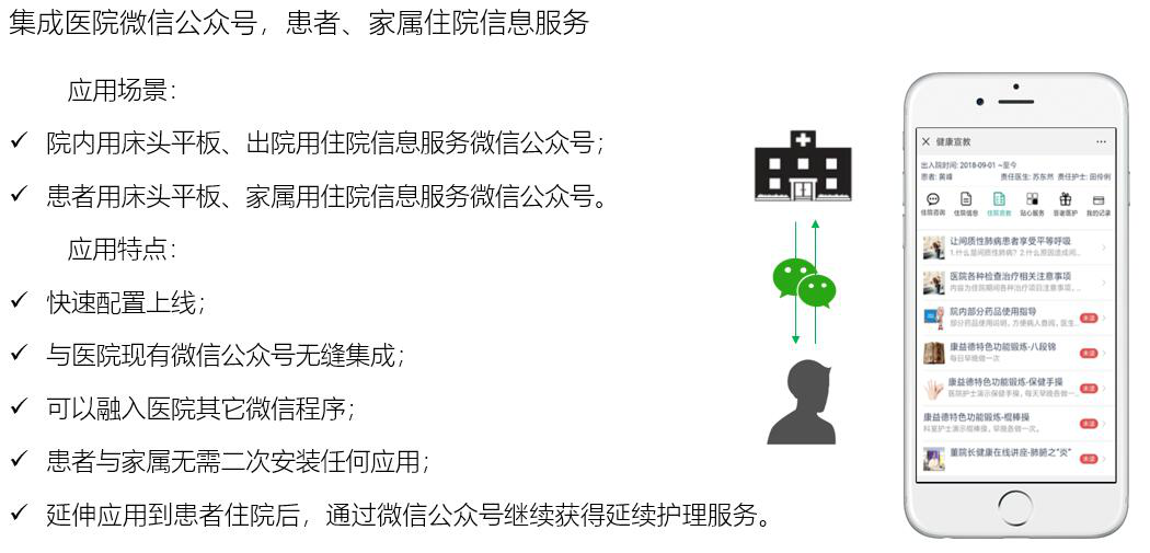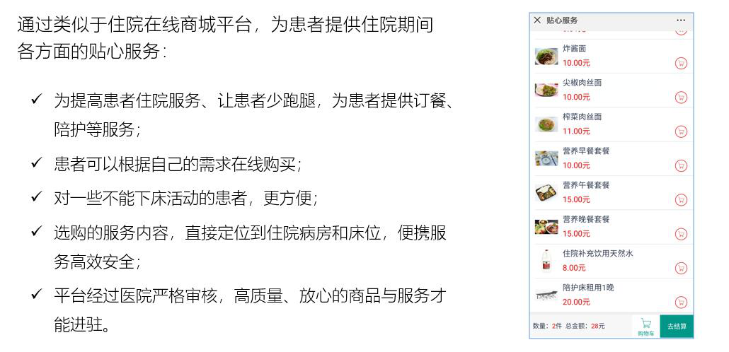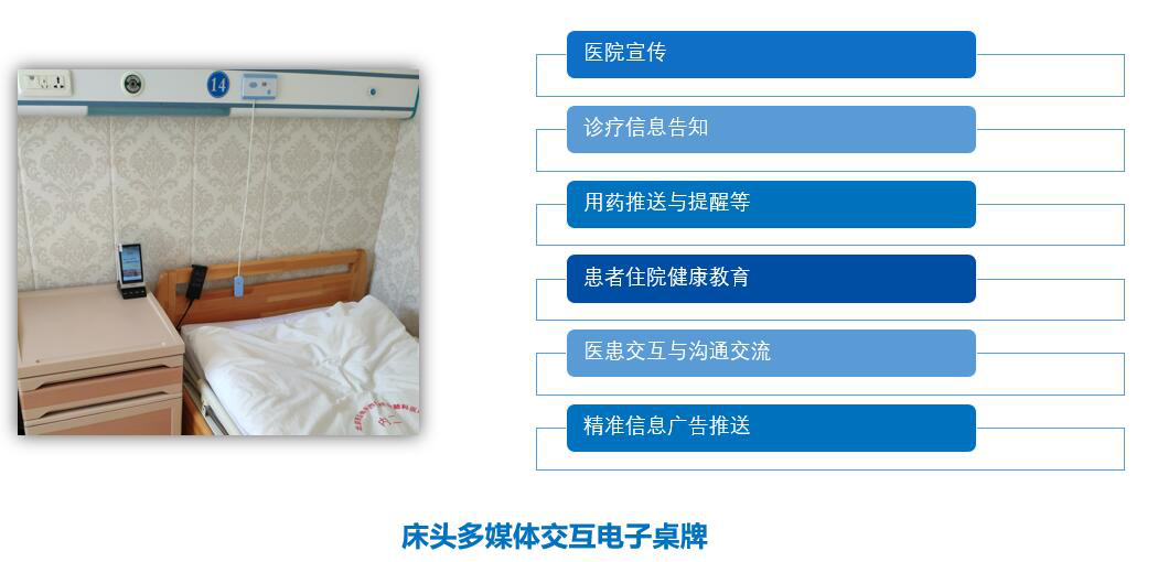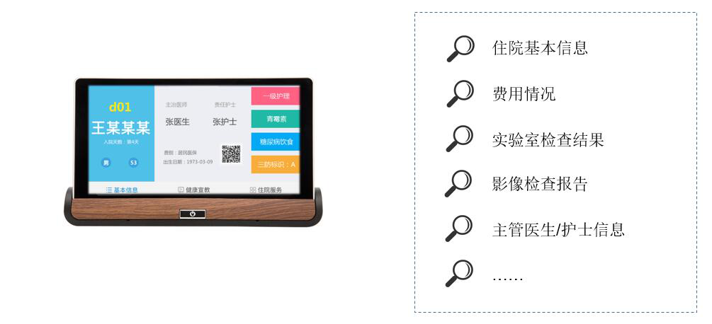 拓展床旁醫(yī)護(hù)、營養(yǎng)點(diǎn)餐、患者貼心服務(wù)、醫(yī)患交流、住院宣教、健康指導(dǎo)等功能,改善住院服務(wù)流程,改善患者就醫(yī)體驗(yàn),優(yōu)化醫(yī)患交互,改善醫(yī)療服務(wù)模式,提升智慧醫(yī)療的效率和水平。