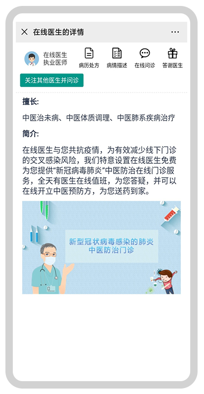 在線診療服務(wù)旨在通過在線診療平臺免費(fèi)賦能就醫(yī)體驗(yàn),讓患者在家安心隔離,避免患者對病情不清楚隨意前往醫(yī)院造成不必要的聚集性感染,從而降低感染風(fēng)險。合理利用醫(yī)療資源,進(jìn)一步讓醫(yī)療衛(wèi)生行業(yè)和廣大人民群眾都共享智慧醫(yī)療創(chuàng)新中心帶來的高效便利診療服務(wù),保障廣大患者及公眾的生命安全和身體健康。