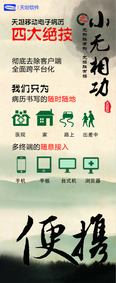天坦軟件,作為國(guó)內(nèi)移動(dòng)電子病歷的先行者,盛裝亮相京交會(huì)。在會(huì)上展示了以“天坦移動(dòng)電子病歷”為核心的醫(yī)院整體信息化系統(tǒng),受到眾多參觀者的關(guān)注。天坦軟件始終堅(jiān)持以“讓天下沒有難看的病”為宗旨,致力于醫(yī)療事業(yè)發(fā)展。為中國(guó)醫(yī)療衛(wèi)生行業(yè)的信息化建設(shè)以及個(gè)人健康服務(wù)提供從硬件到軟件、從技術(shù)到服務(wù)的全面解決方案,是中國(guó)醫(yī)療信息化市場(chǎng)中快速成長(zhǎng)的獨(dú)立軟件廠商之一。數(shù)年來(lái),一直堅(jiān)持研發(fā)以移動(dòng)電子病歷為核心的醫(yī)院信息化系統(tǒng),從移動(dòng)框架的病歷編輯器到跨平臺(tái)的移動(dòng)醫(yī)療解決方案,為整個(gè)病歷信息化行業(yè)注入了極強(qiáng)的創(chuàng)新活力。 “天坦移動(dòng)電子病歷”為核心的醫(yī)院整體信息化系統(tǒng)秉承“高效應(yīng)用、信息互通”的基本理念,是專門為醫(yī)院設(shè)計(jì)開發(fā)的醫(yī)療信息化系統(tǒng)的核心組成部分。具有高效、安全、穩(wěn)定、易用、移動(dòng)、智能等特點(diǎn),除此之外,還具有穩(wěn)定、完全跨平臺(tái)運(yùn)行、功能強(qiáng)大、系統(tǒng)性能卓越等巨大優(yōu)勢(shì)。