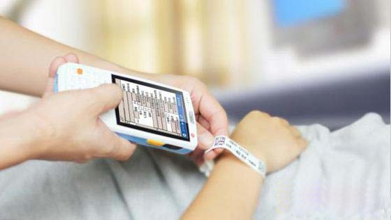 5月15日,記者來到心內(nèi)科病房時,孫洪巧正拿著移動護理終端(PDA)巡房。只見她拿著PDA在病人手腕上一掃,然后把量好的體溫、血壓數(shù)據(jù)輸入PDA,巡房工作就完成了,速度之快連病人都有些不習(xí)慣。